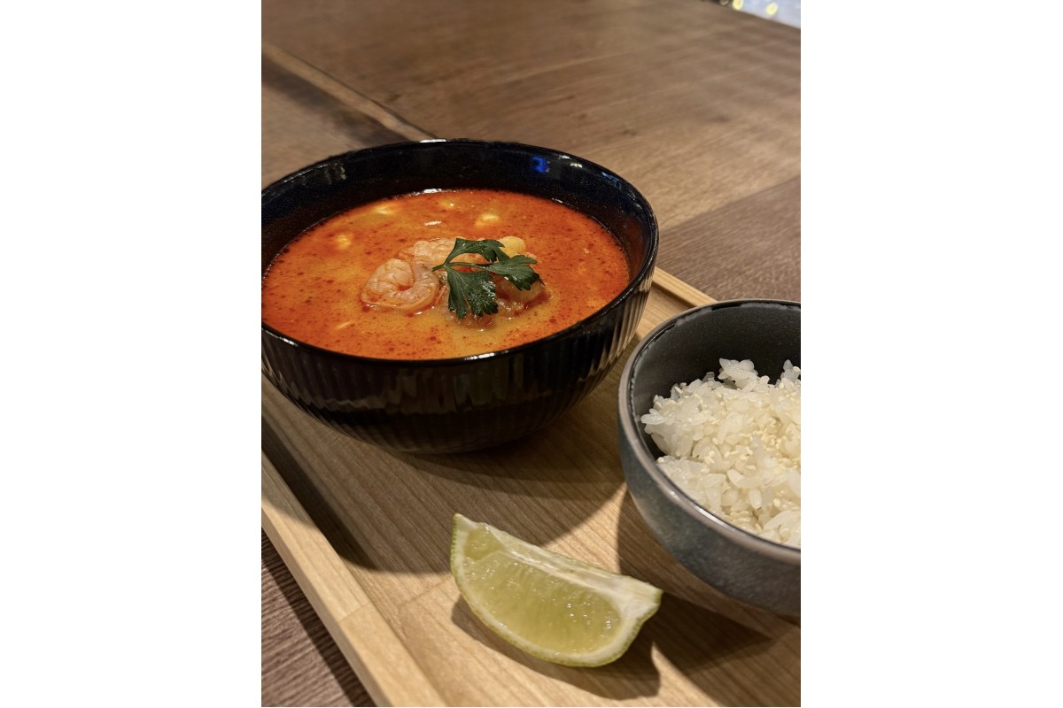 Пряный микс бульонов из креветок, куриного мяса и рыбы, кольца кальмара, креветки, шампиньоны, томаты черри, кокосовые сливки, ароматная кинза. Подается с долькой лайма и отварным рисом