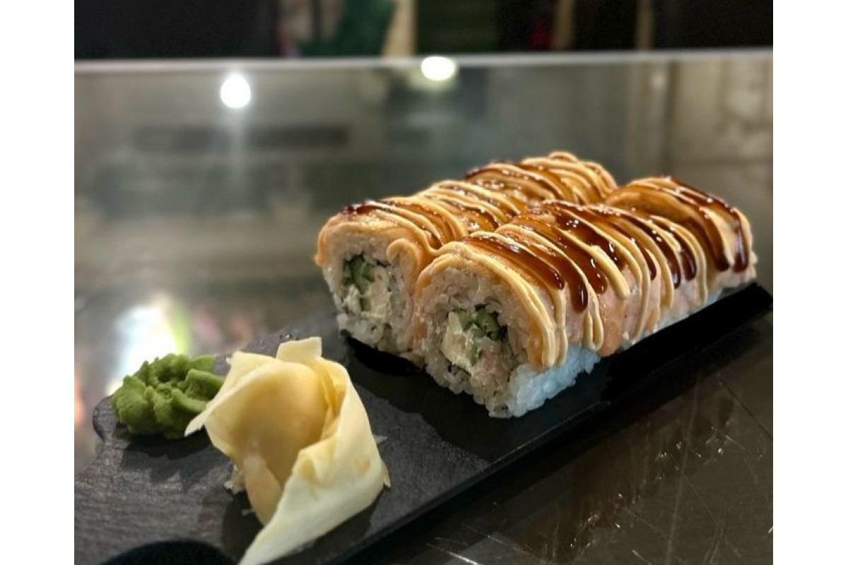 Состав: нори, рис, творожный сыр, креветка, огурец, лосось, спайси соус, унаги соус.